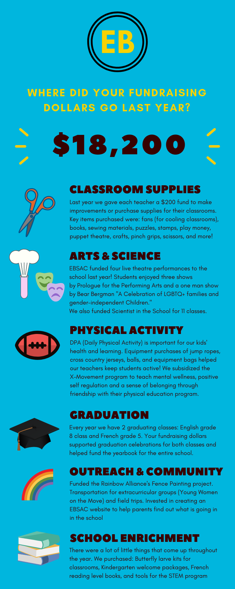 EBSAC gets a lot of questions as to what we spend fundraising dollars on. If you have been at the school for the last few years you know there have been major pushes to fundraise for larger capital expenses like the field and playground equipment. Still, we can’t forget the day to day activities, programs and supplies that are required by teachers and students on a more regular basis. These are some of the things EBSAC paid for last year with fundraising dollars from bake sales, dance-a-thon, Marlies, movie nights and other school initiatives.