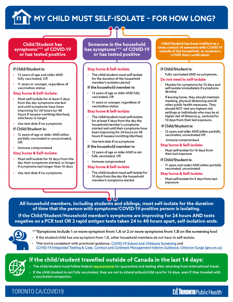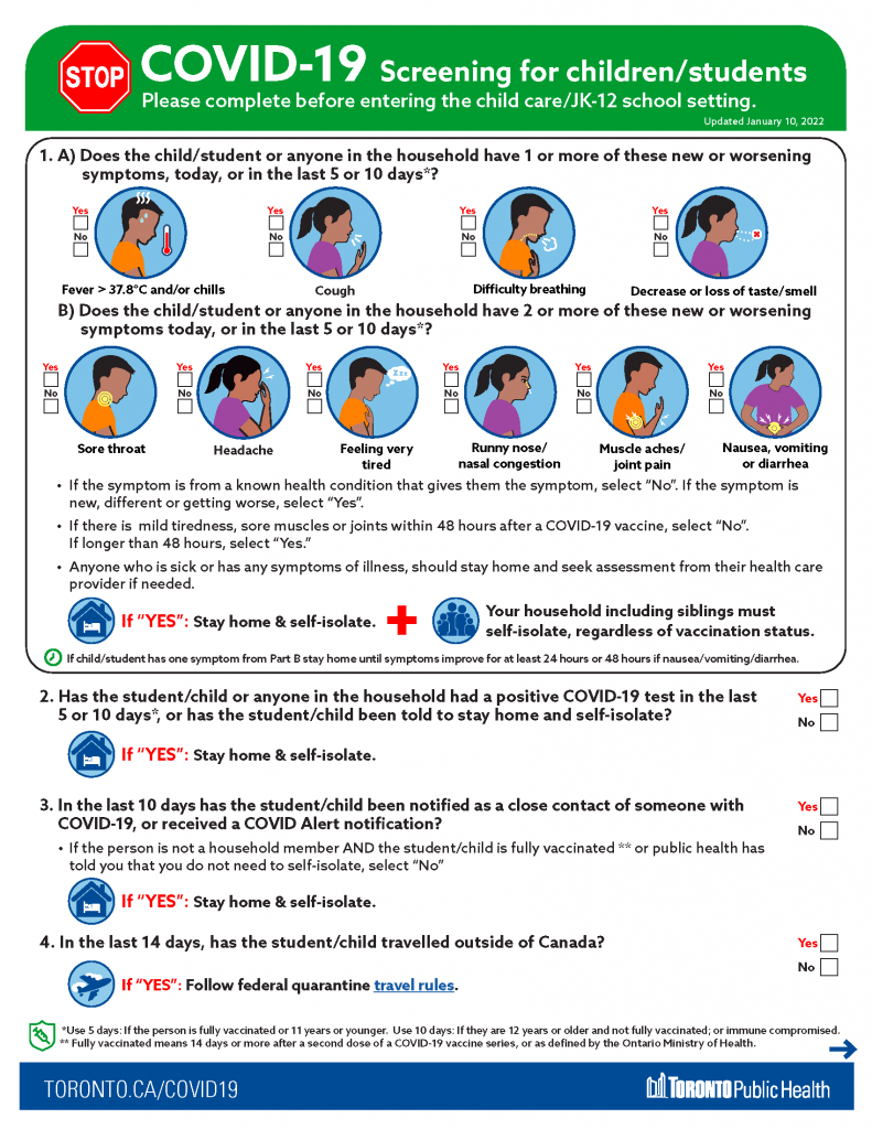 PROTOCOLS:We have attached the new TDSB protocols and screening tools. We recognize this is very difficult to understand and is very stressful. Our take on it: Should you have a family member in the home that has one or more of these symptoms (even just the sniffles) everyone in the household should stay at home and isolate for 5 days. The child can return to school after 5 days and being symptom free for 24 hours. By following these guidelines, we will help keep everyone in the school and community safe.
